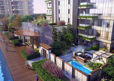 深河道森林峽谷景觀,主景觀軸由東向西貫穿整個項目,四季活水不斷,湖面面積近6000㎡,水系相連,完全可以實現水上泛舟的效果。在湖的南側,洋房北側由東向西沿湖設計單臂風雨連廊,連接着每個單元門口,風雨連廊在樓間還設有休息平台,業主可以在此小憩。